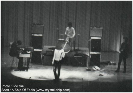 ![]() Voici une photo qui a été prise lors du concert des Doors au Danbury High School Auditorium, le 11 octobre 1967. Celle-ci a été réalisée par le photographe Joe Sia qui a photographié les Doors à quelques reprises dont le célèbre concert de New Haven en 1967. D’après des revues du concert, le groupe semble avoir donné une très bonne performance malgré l’atmosphère stricte de la foule et une acoustique de la salle de très mauvaise qualité. Jim a essayé de capter l’attention de la foule en réalisant quelques acrobaties sur scène, même que, à la fin de la chanson The End, il a bondit en bas de la scène directement en face des spectateurs, tourné sur lui-même à maintes reprises et il a ensuite bondit de nouveau sur la scène pour compléter le concert. Pour terminer, il a frappé le sol avec son micro jusqu’à ce que le plancher de la scène se brise et il a sortit de la scène sans y retourner pour un rappel. D’ailleurs, on peut remarquer la présence d’une cymbale de John sur la scène, une conséquence d’une « folie » de Jim pendant le concert.