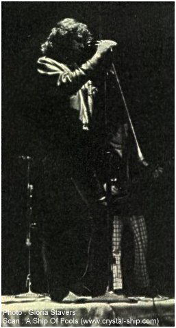 ![]() Cette photo a été prise par Gloria Stavers qui a été la rédactrice en chef du 16 Magazine et a fréquentée Jim à plusieurs reprises. Celle-ci a été publiée dans une édition du magazine Master Of Rock en 1990 complètement consacrée aux Doors et provient du concert du 14 septembre 1967 à Cleveland. La photo n’est pas très claire, mais c’est la seule et unique photo du groupe sur scène de ce concert qui existe à ce jour.
