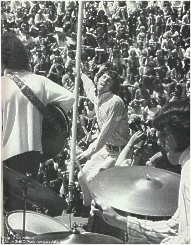 ![]() Cette photo a été prise par le photographe Gene Anthony lors de la performance des Doors au Fantasy Faire & Magic Festival, le 10 juin 1967. D’après celle-ci, le groupe, et tout particulièrement Jim, semblent être dans une excellente forme. D’ailleurs, il y a deux courts vidéos qui existent de ce concert, l’un ayant été filmé en 8mm par un fan de l’audience et un autre ayant été filmé professionnellement par les responsables du festival. De ce fait, vous remarquerez sur cette photo qu’il y a une personne qui réalise un gros plan de Jim avec sa caméra à quelque centimètre de lui. Peut-être aurons-nous la chance de voir ce film en entier un jour...