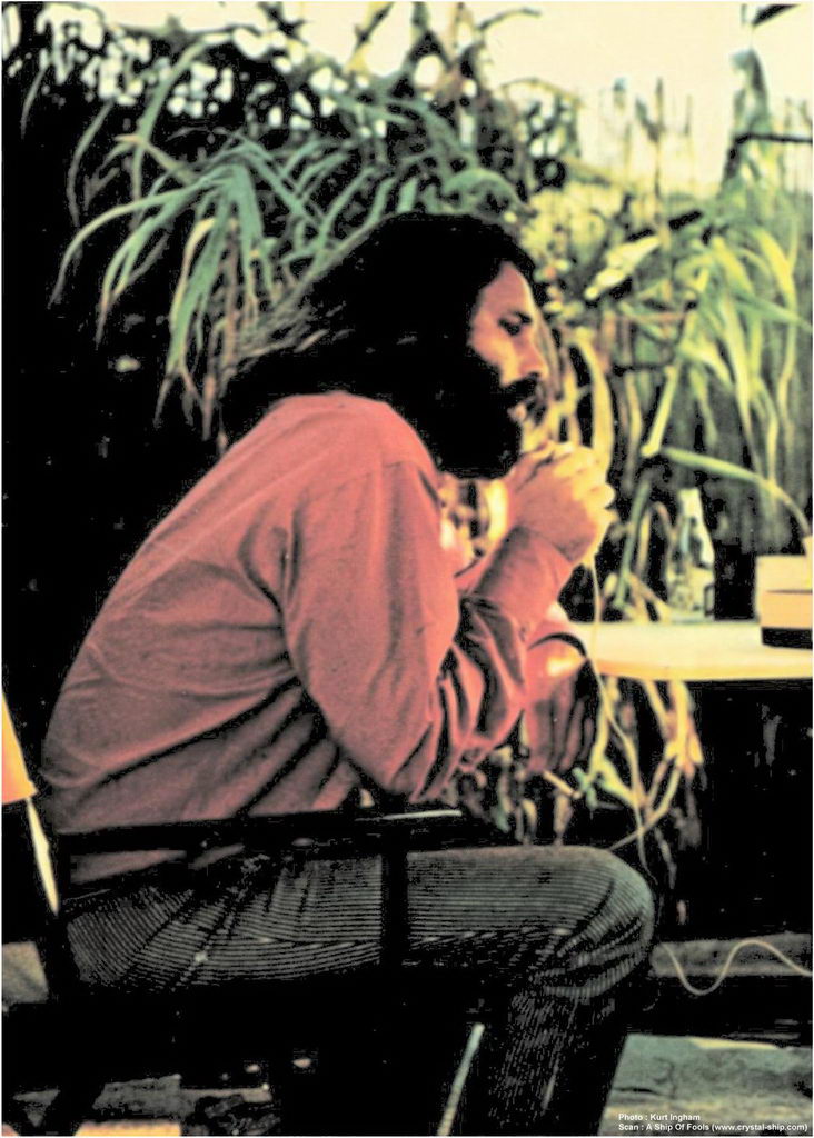 ![]() Cette photo, prise par le photographe Kurt Ingham, a été publiée dans le numéro de janvier 1971 du magazine Circus. Elle montre Morrison pendant l’entrevue qu’il a accordée le 13 octobre 1970 à la journaliste Salli Stevenson dans le jardin se trouvant à l’arrière du bureau des Doors. L’entrevue a été publiée en deux parties, la deuxième se retrouvant dans le numéro de février 1971. D’ailleurs, cette entrevue sera la prochaine à paraître sur Bright Midnight Records, le 8 février 2002.